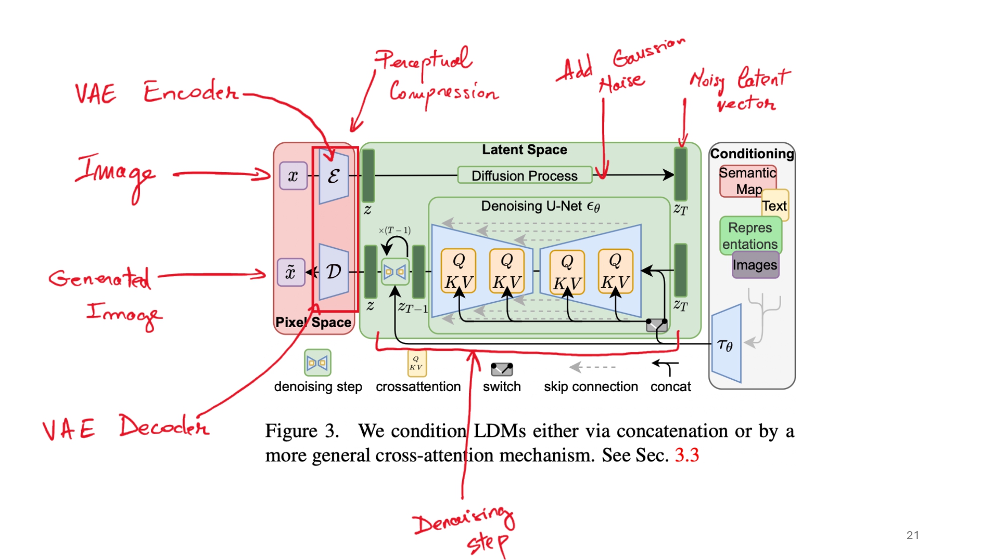 - The U-Net Backbone: At the heart of the LDM is a U-Net architecture that learns to denoise images. The U-Net consists of: