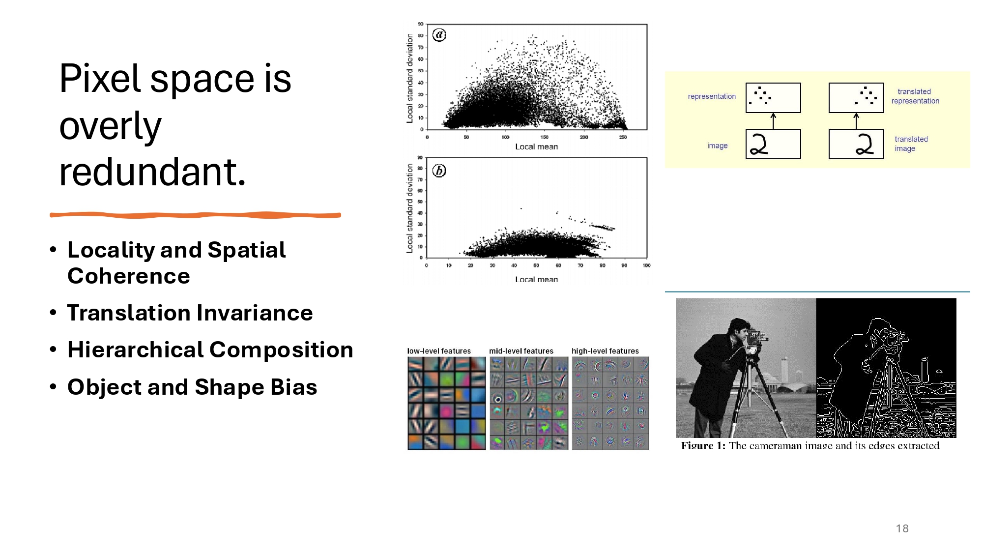 High-level patterns (e.g., objects) in images are composed of lower-level features (e.g., edges, corners, textures).